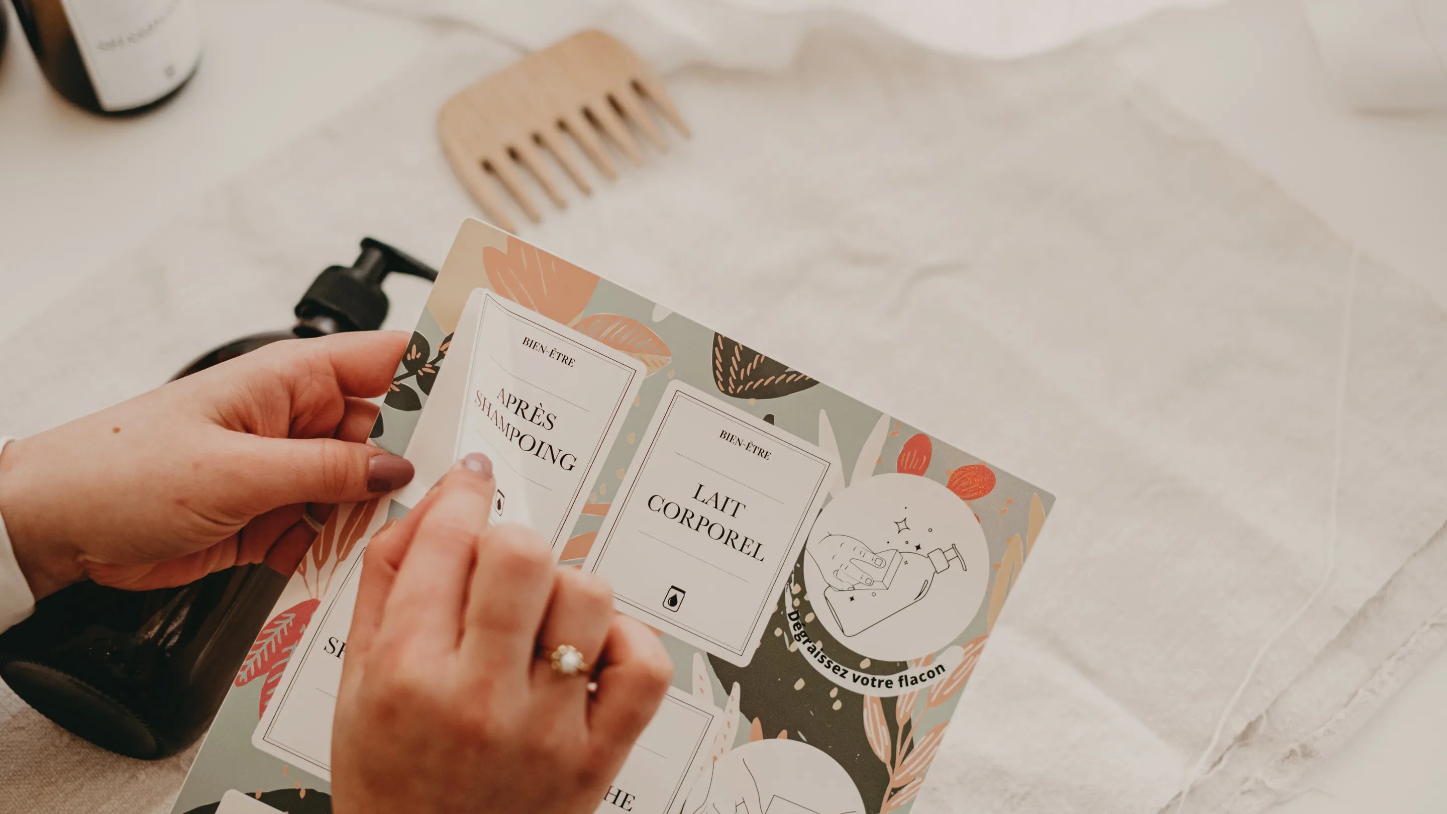 Apportez de l'ordre et du style à vos flacons en verre grâce à nos planches d'étiquettes waterproof spécialement conçues pour les distributeurs de savon, sprays, vaporisateurs, et bien plus encore. Disponibles à l'unité (savon, shampoing, après-shampoing, vinaigre blanc, liquide vaisselle, lessive, nettoyant multi-usage etc...) ou en planches thématiques (ménager, droguerie, buanderie, bien-être, set de voyage), elles vous permettent de personnaliser chaque produit avec clarté et élégance.
