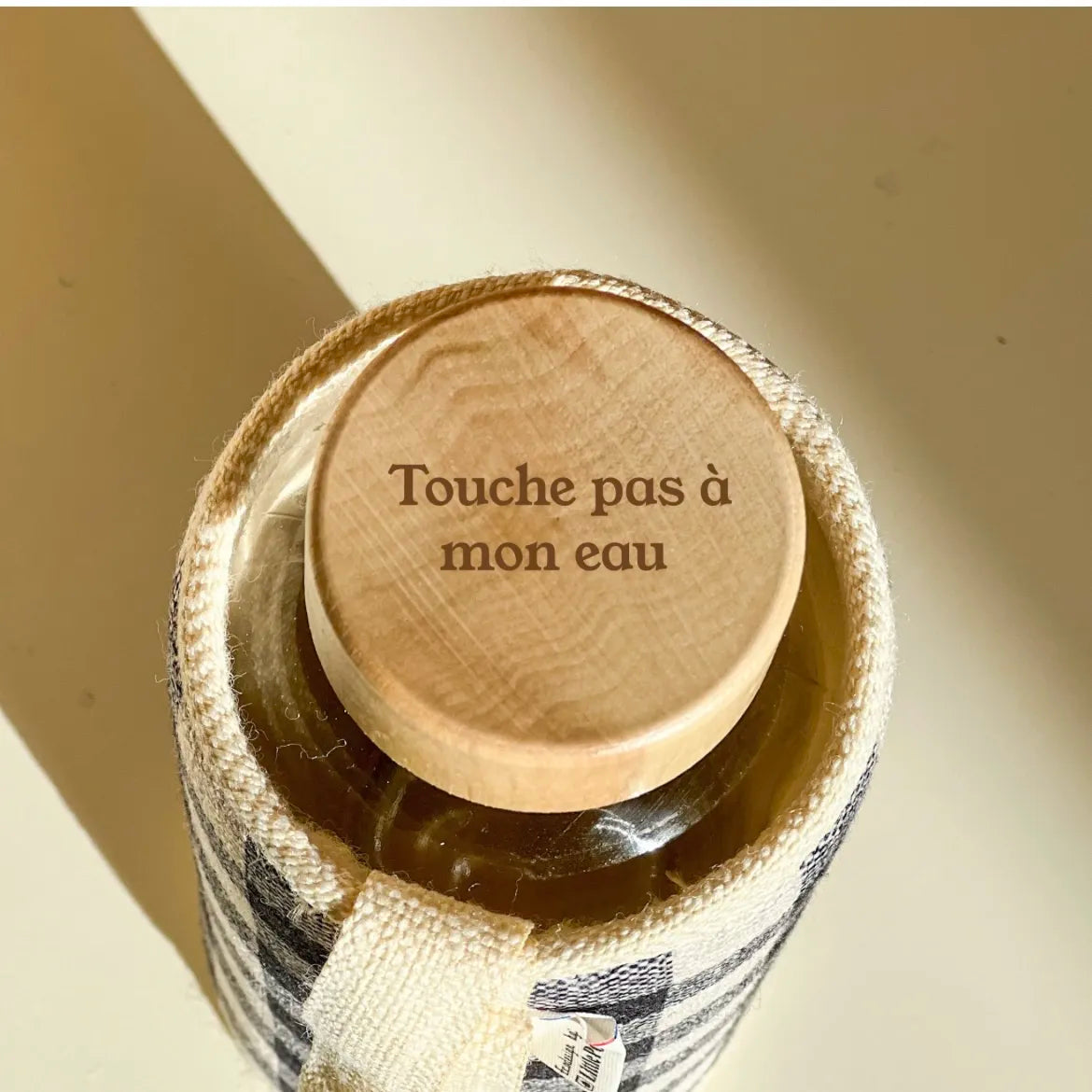 La gourde en verre recyclé est fabriquée en Italie, le bouchon en bois de hêtre FSC est fabriqué également en Italie. La housse est fabriquée à la main dans nos ateliers partenaires en France à quelques kilomètres de notre entrepôt.