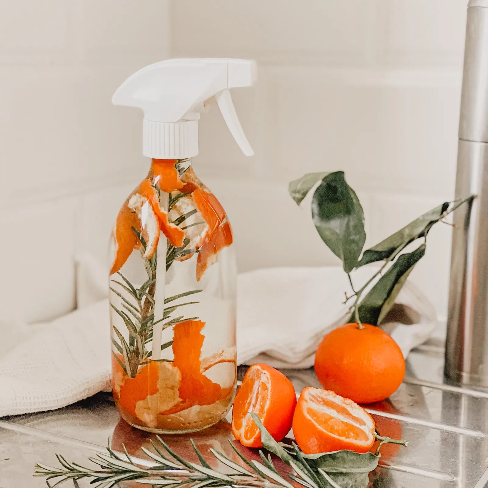 Mélangez du vinaigre blanc et de l'eau à parts égales dans un flacon spray en verre, et complétez si vous souhaitez avec quelques gouttes d'huile essentielle de votre choix pour une odeur agréable. Vous pouvez aussi utilisez des zestes de clémentine, du thym pour parfumer naturellement.