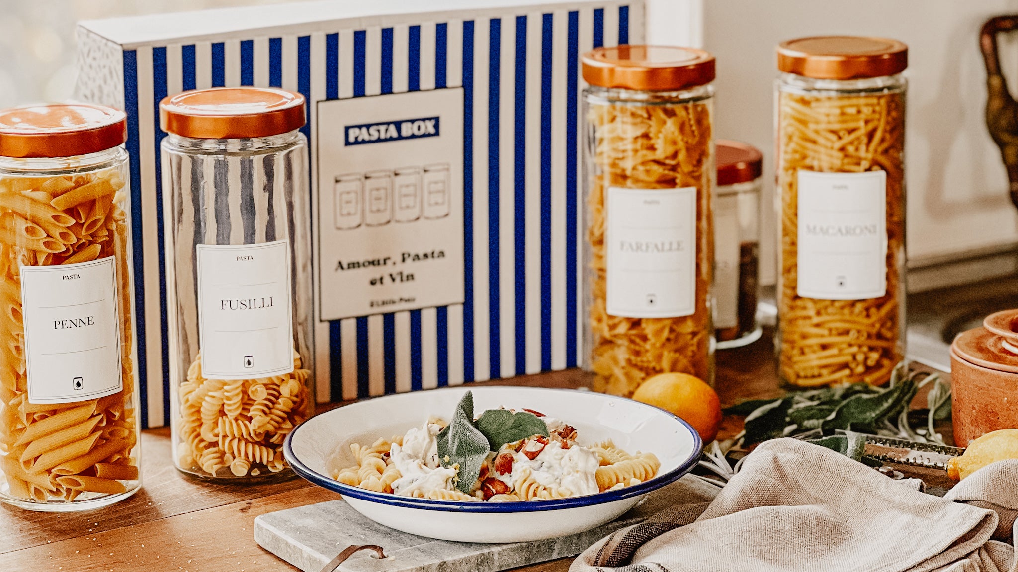 La Pasta Box comprend 4 bocaux de conservation de la gamme Muscadin d'une contenance de 1L, un trio affiches A5 Pasta Lovers et une planche d'étiquettes pour identifier toutes vos variétés de pâtes