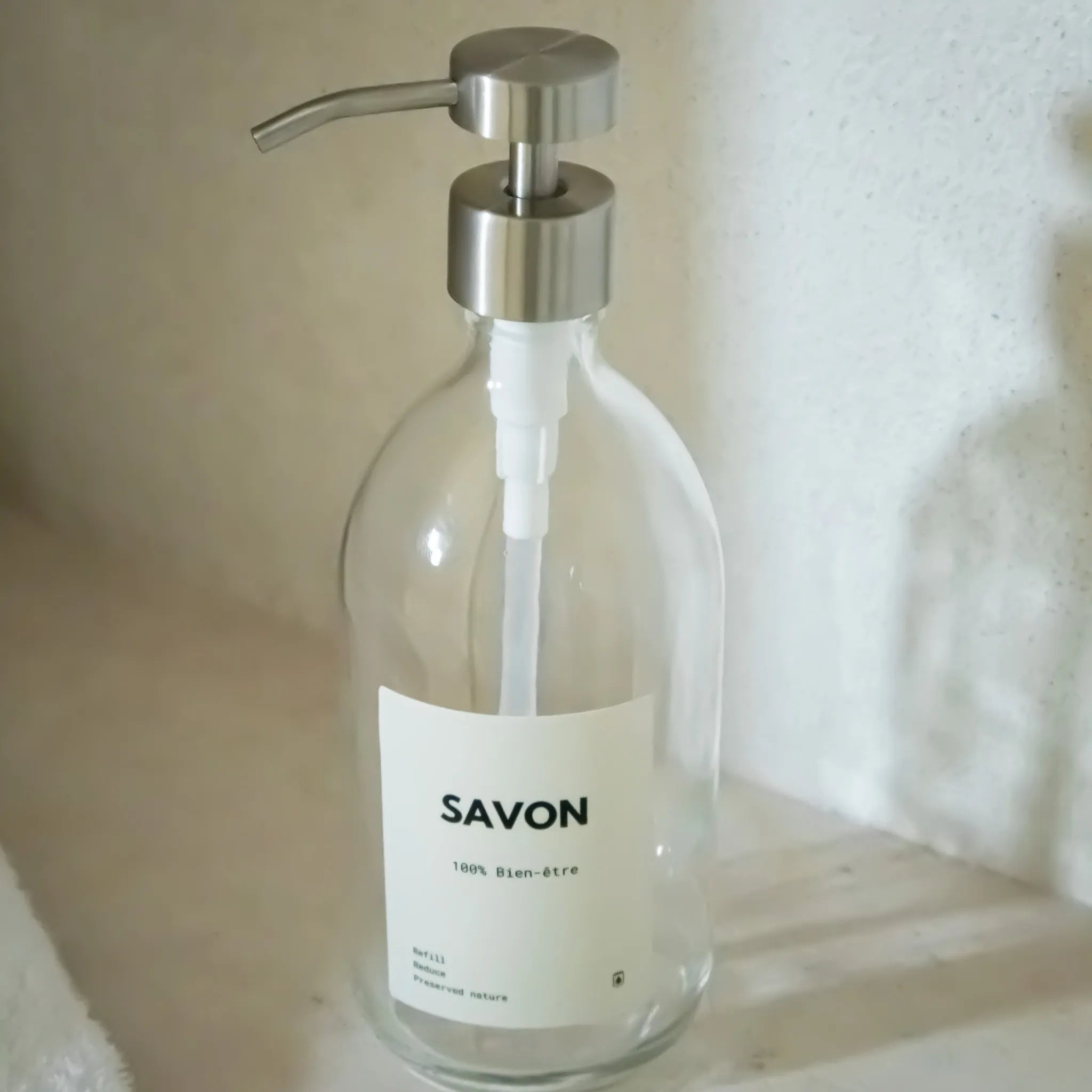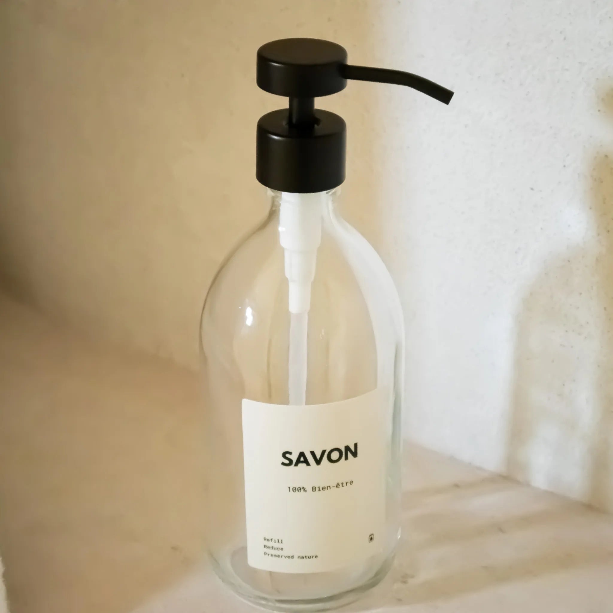 Tout d'abord, remplissez le distributeur de savon en verre avec le produit de votre choix.